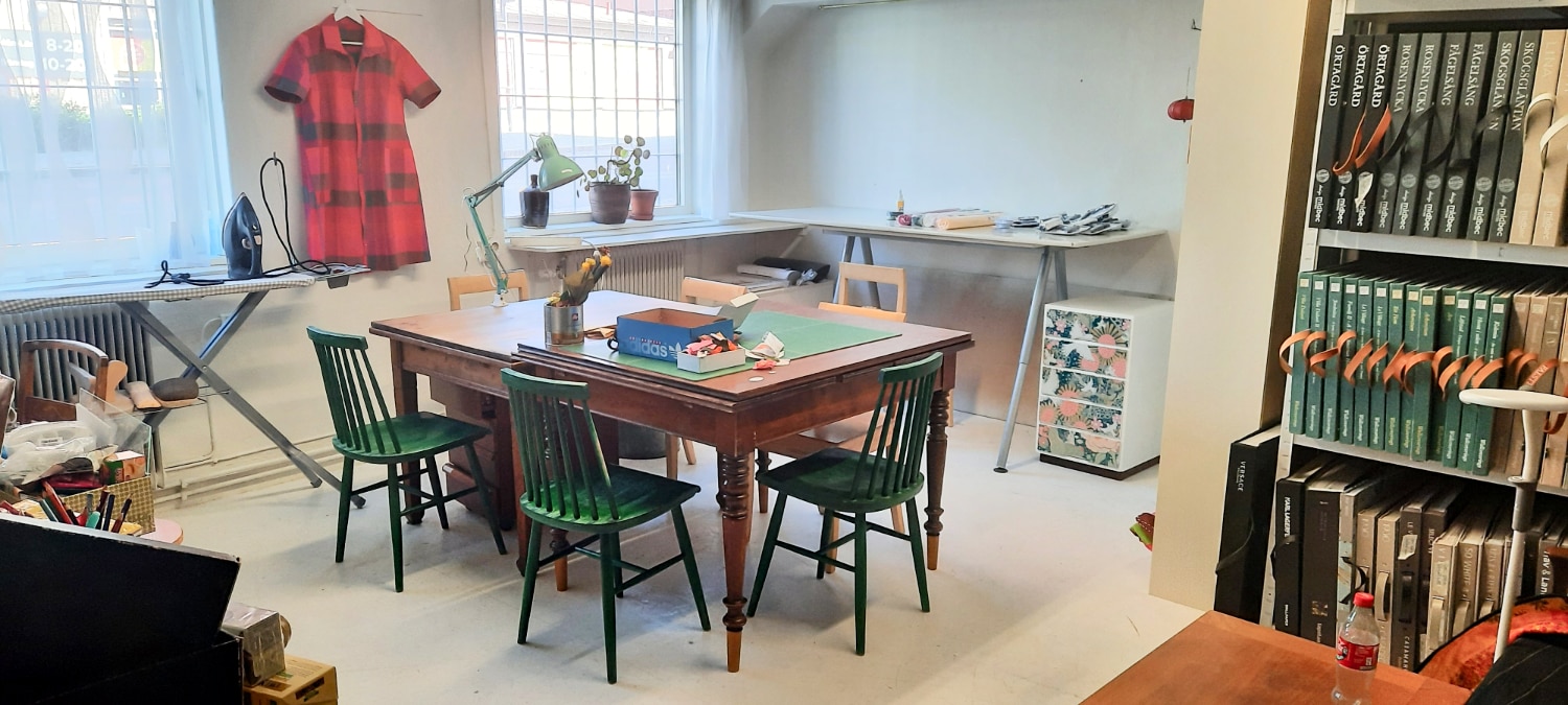 Rum1 har ett bord med sittplatser för 8-10 personer, arbetsplats för symaskin och ett höj och sänkbart arbetsbord för till exempel tillskärning. Här finns även en liten hörna med soffa och bord.